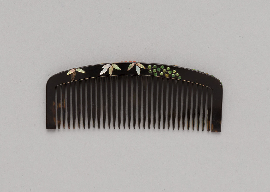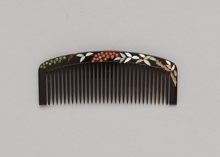 鼈甲製、新橋形、角棟の挿櫛である。新橋形は明治33年(1900)頃から流行したとされ、雑誌『流行』(1900年)では若向き年増向きともに一般にもてはやされたとされる。同じ形状をカタログ『三越』(1911年)では操形としており、25,6~30歳向きとしている。黒漆地に螺鈿と珊瑚・翡翠を彫嵌して南天を表している。花柳章太郎(1894~1965)の旧蔵品で平成15年(2003)に遺族の青山久仁子氏より国立劇場へ寄贈された。
