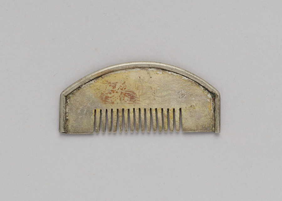 銅製銀鍍金、深川利休形の挿櫛である。利休形は、『玳瑁亀圖説』によると江戸で寛延・宝暦頃(1748~1764)に大ぶりなものが流行したが、文政8年(1825)以降の江戸において櫛が小型化する中で、小ぶりな深川利休形が考案され、京・大坂にも伝播した。京・大坂のものは親歯の幅が広い。表に松竹梅の毛彫があり、裏面は無文で、棟から耳に覆輪を廻らす。花柳章太郎(1894~1965)の旧蔵品で平成15年(2003)に遺族の青山久仁子氏より国立劇場へ寄贈された。
