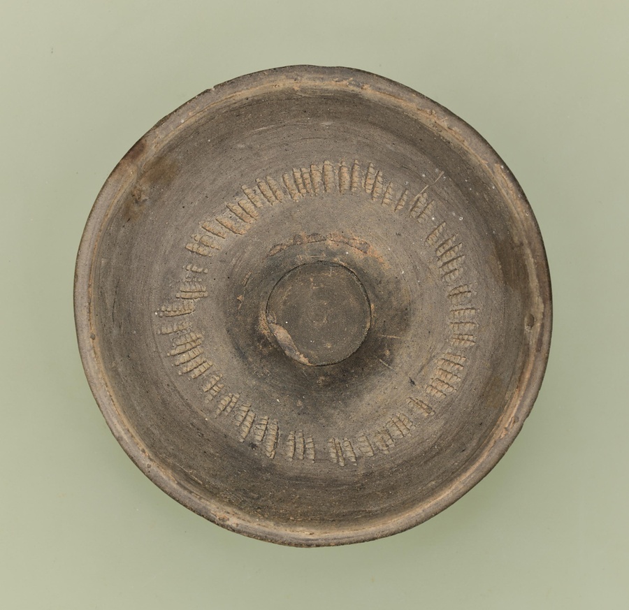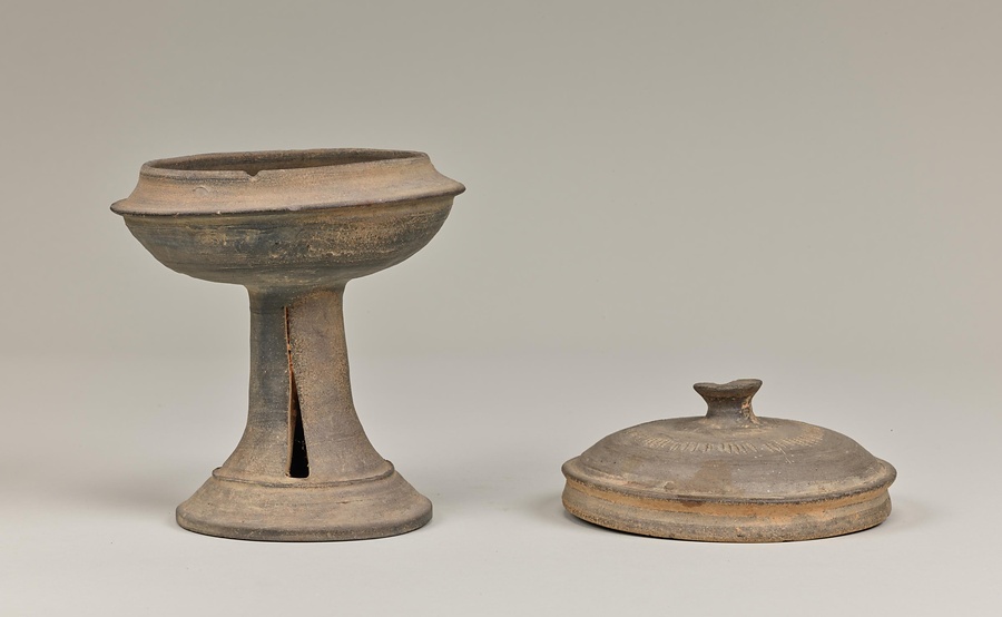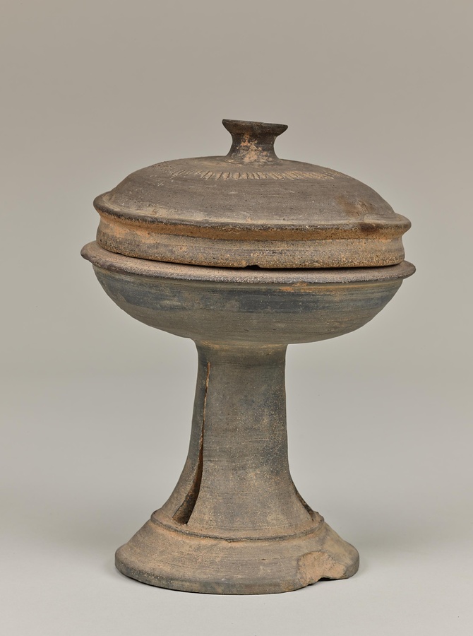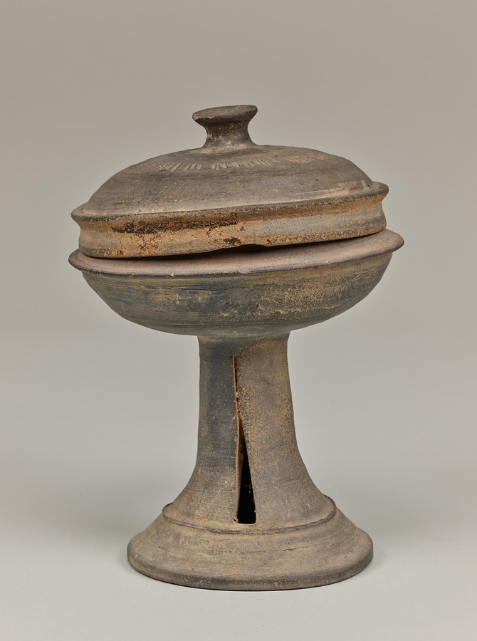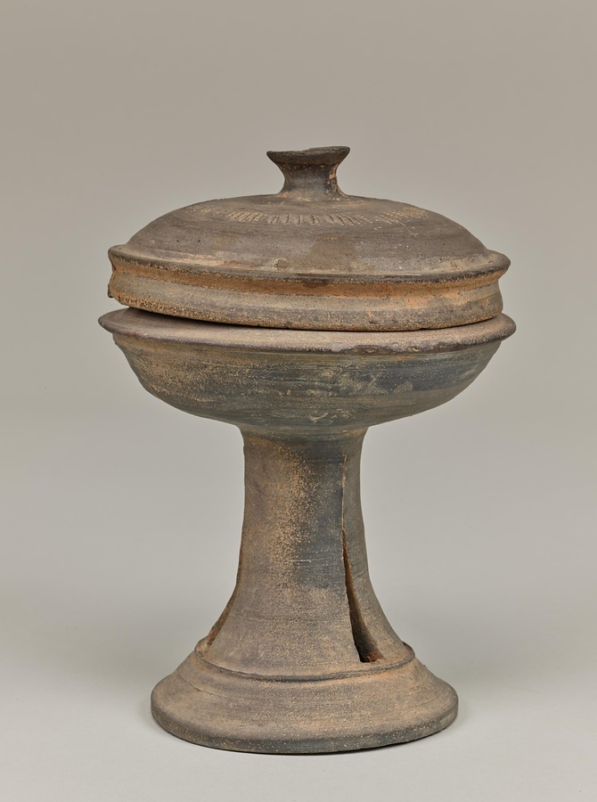 高杯は三国時代の朝鮮半島南部で盛んに製作された器ですが、地域ごとに形とデザインが異なっており、個性がみられます。この高杯は脚部を三角形に切り取った透窓をほどこす加耶の特徴に加えて、筒状の脚部が裾@すそ@に向かって緩やかに広がる阿羅加耶の特徴を備えています。