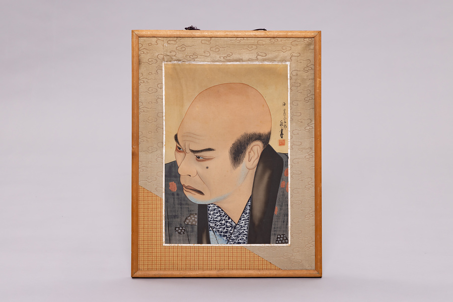 昭和14年(1939)8月、大阪歌舞伎座で初演された「海」は「二十五分の短い作で、舞台一面を海にし、小舟で夜釣りをしている五郎の漁師が身投げの美人を助け、その女はそれを初めは嫌がりながら、再び生の執着からあべこべに助かつたのを喜んで逃げ出す」(「一堺荘漫筆」)というもので、評論家・三宅周太郎から「作意もウヰツト」があり、「舟をモーターにして動かすのが、廻り舞台にうまくはまるなど、実に才気煥発な作」と激賞され、本人としても会心の作だったようだ。俳優の似顔絵をよく描いた画家・芳賀敏兼(雅号・松龍庵)の筆によるもので、贔屓客が依頼して五郎に贈ったものだろう。