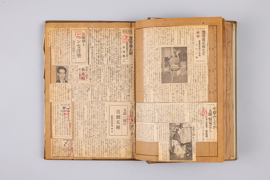 布張りの茶の表紙に、油性ペンで「東京 劇評」と書いてある。昭和10年(1935)5月4日〜昭和12年(1937)1月までの新聞記事が掲載されている。最後が曾我廼家蝶六の死亡記事になっていることからわかるように、劇評に限らず、新聞に掲載された五郎劇関連の記事を切り貼りしている。新聞名と年月日を記した丸印スタンプを押しており、五郎の生真面目さがうかがえる。現在では原紙が保存されていない新聞も多い。また、巻末には昭和7年(1932)6月1日付の『曾我廼家新聞』、同年11月1日付の『新歌舞伎ニュース』が綴じられている。