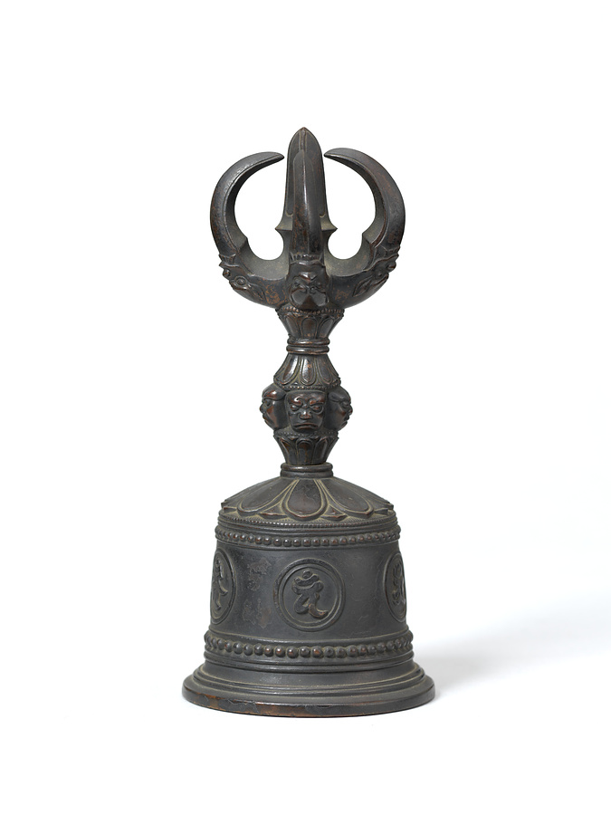 鈴身の円相内に、大日(バン)から左に、不動(カン)、釈迦(バク)、文殊(マン)、普賢( アン) の五仏の種子を配する。不動以下四尊は、七七忌と年忌供養を司る十三仏のうち初七日、二七日、三七日、四七日の本尊の順序に一致し、大日は十三回忌本尊となる。とすれば、ごく初期の十三仏信仰の、しかも密教遺品ということになり、この信仰の成立事情の一端を示す重要作例と評価されよう。