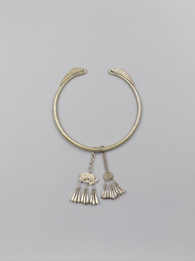 ベトナムは、人口の90パーセントをキン族(ベト族)が占めるが、ほかに中国系の人々と53にもおよぶ少数民族が暮らす多民族国家でもある。そのなかでもモン族は、シナ・チベット語系メオ・ヤオ語族系の民族として知られ、中国南部の雲貴高原からベトナム、ラオス、タイの山岳地域に居住している。古来、山間盆地や斜面に集落を営み、焼畑農耕のほか、陸稲栽培を行いつつ移動生活を行う人々と、水耕稲作を行う定着生活をする人々がいたが、近年では焼畑は制限され、水稲を生業とした定住生活が一般的となっている。モン族を代表する工芸として刺繍や染織とともに高い評価を受けているのが銀細工である。銀細工は山間に住む少数民族の生活の様々な場面で用いられ、特に新年の祝いや婚礼の際などには、富貴や健康、幸福を願う象徴として非常に好まれるものである。本作もその特徴を有する作品といえる。