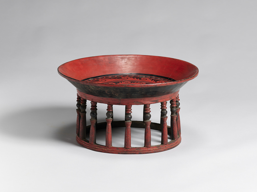 ミャンマーにおいて漆器は「ユン(yun)」と総称され、人びとの日々の生活や仏教などの宗教行事、建築空間における装飾などミャンマー社会に深く根付きながら多種多様に発展してきた工芸である。当地で作られる漆器の素地は、竹をはじめ木、馬毛、金属、布など様々であり、加飾技法も蒟醤や箔絵、下地盛り上げ、ガラス象嵌、漆絵、変わり塗、卵殻など多岐にわたる。主な漆工芸の産地としては、マンダレー管区のマンダレー市内のほかバガンやインワ、ザガイン管区のチャウッカ、シャン州のチャイントンやインレー湖周辺などがよく知られている。技法・意匠とも産地ごとに個性がみられるが、なかでも本品は器種・加飾技法・意匠のいずれもシャン州でつくられてきた典型的な作である。ほぼ同形同寸の類品として、浦添市美術館所蔵品に「朱漆花文漆絵卓」がある。