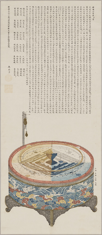 本品は、仏教天文学の祖と呼ばれた天台宗の僧侶、普門円通(1754-1834)が、「須弥山説」を分かりやすく示すための模型、須弥山儀を描かせた絵図である。
