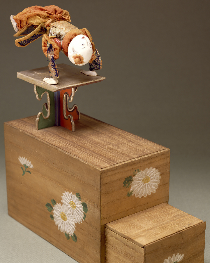 祭礼の山車からくり(糸操り人形)と、室内で鑑賞する座敷からくりは、いずれも江戸時代に流行した。座敷からくりは当時のハイテクノロジーの結晶で、水銀、砂、ゼンマイなどを動力に用いる。これは人形の内部に仕込まれた水銀の移動による重心の変化で、とんぼ返りをしながら段をおりていく人形。寛政八年(一七九六)には、内部の仕組みを詳述した『機巧図彙』という本も出版された。
