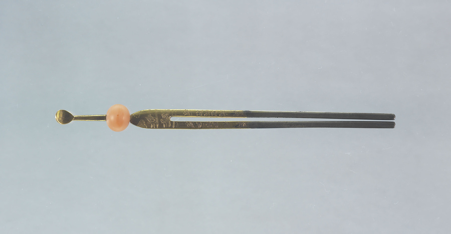 瑪瑙玉に銀製金色絵の耳掻きと二本足が付いた玉簪である。足の表には隅田川に都鳥と散桜、裏には寄裂文の毛彫がある。花柳章太郎(1894~1965)の旧蔵品で平成15年(2003)に遺族の青山久仁子氏より国立劇場へ寄贈された。