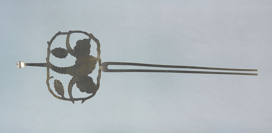 銀製二本足の平打簪で、桐を透彫と毛彫で表している。簪は笄から分化して発生し、二本足の簪は享保以降に出現した。延享元年(1744)に金銀製の櫛・笄が禁止されてからは象牙・鼈甲・錫が用いられたが、寛政頃から金銀製の簪が再流行した。花柳章太郎(1894~1965)の旧蔵品で平成15年(2003)に遺族の青山久仁子氏より国立劇場へ寄贈された。
