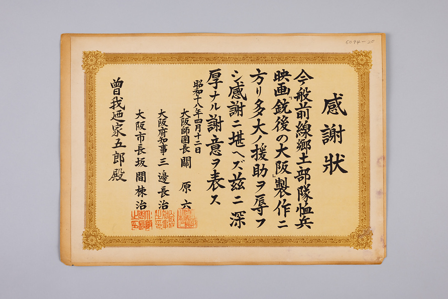ボール紙に布張りの表紙に「御奉公」「足跡集」「曾我の家」とある。昭和6年(1931)9月、満州事変が始まる頃から、五郎は数々の国策に協力するようになる。傷病兵や工員の慰問のため各地の陸海軍病院や軍需工場に赴いて公演を行っただけでなく、軍需品購入のため献金を醵出(きょしゅつ)したり、「弾丸切手」とよばれる、戦費調達のため発売した、抽選くじ付きの郵便貯金債券の売りさばきに協力したりもした。「御奉公足跡集」は、五郎のその功労を讃え軍や官公庁、市町村の長などが送った感謝状を保存したもので、34点が残されている。その一つに『銃後の大阪』感謝状がある。「恤兵(じゅっぺい)映画」とは、前線で戦う兵士の慰安のために作られた映画のこと。映画『銃後の大阪』のうち、五郎劇の舞台「へちまの花」を記録した一部はマツダ映画社が保存している。
