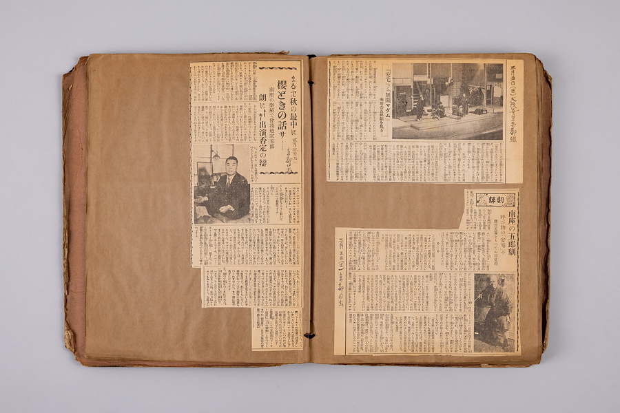 黒の表表紙に赤インクで「劇評集」「Collected by S. Kashiwagi」とあり、見返しには「自昭和七年九月 至(空欄)」「劇評集」「Edited by Sencho」とある。柏木泉蝶は五郎の遠縁にあたる人で、当時五郎劇の脚本部に属していた。昭和9年(1934)5月までの五郎劇関連の新聞・雑誌記事が切り貼りされている。