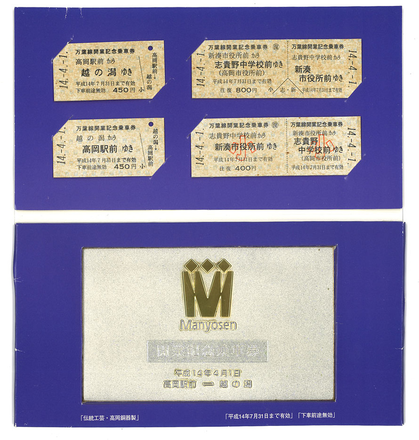①~⑤はいずれも平成14年7月31日まで有効。①、②は硬券A型。③、④は硬券D型。⑤は高岡銅器製の乗車券は万葉線のシンボルマークが施されている。開業記念乗車券は3,000セット限定で、1セット3,000円で発売された。