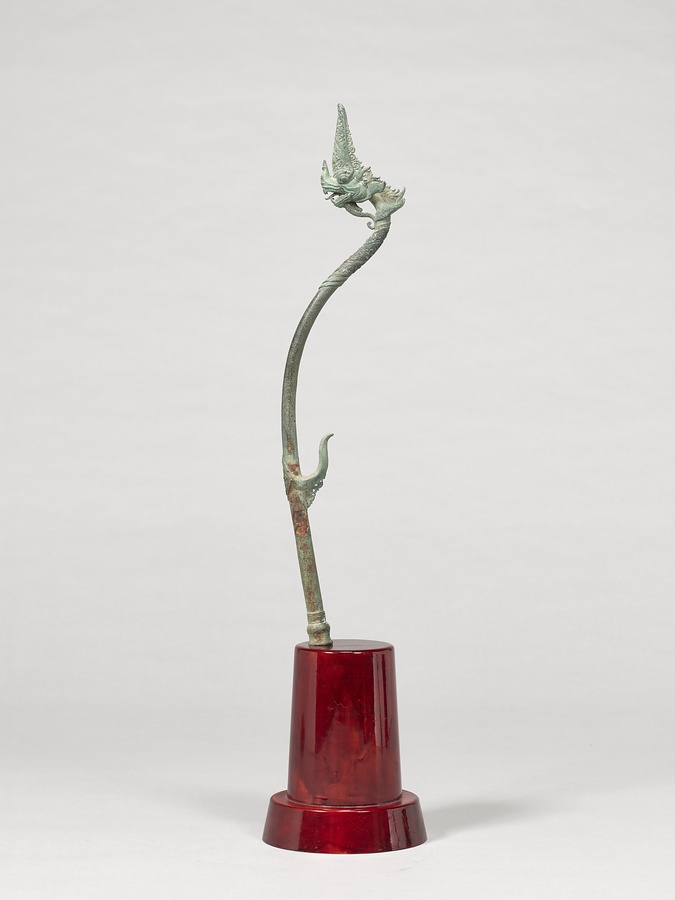 鉄製の心棒を軸とした鑞形鋳造による青銅製の装飾金具。青銅部分は弓なりに曲線を描く龍形の神獣ナーガをあらわす。頭部は頭頂部が高くせり出し、大きく開いた口からは舌を出して上顎・下顎からは牙を生やす。胴は細長い断面円形で、S字状に伸びる。過半の正面には菱形の飾り板をつけ、同心円文を中心に四方に心葉文と珠文を交互に鋳出す。一方背側には鉤形の尾翼が上方へ向かってうねるように伸びる。下端には枘をつくる。本品のように頭頂部を角のように高く尖らせ舌を出した龍頭形の青銅製装飾金具は、タイのスコータイ時代、アユタヤー時代の作例として現地で類品が確認できる。現地では、王の持物あるいは王権の象徴のひとつとして考えられる弓(ヴィシュヌ神の光の弓サルンガ)であるとの説もあるが、これらはその構造から2部ないし3部からなるパーツの一つと考えられるため、その用途は弓以外の可能性もある。