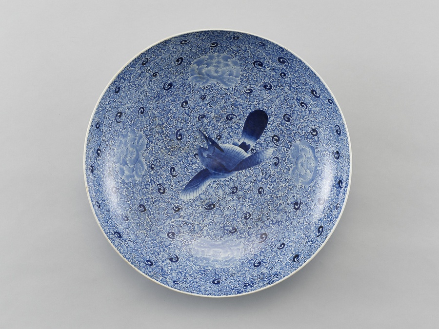 伊万里焼の染付磁器。染付の大皿はアジアやヨーロッパ輸出用に17世紀中葉を中心に大量に作られ、江戸後期になると、国内で料亭などが増えたことにより宴会における需要が高まり、大量に生産された。本作品も江戸後期の18世紀後半から19世紀前半頃の製品と考えられる。裏面に描かれている蛸唐草文は、幕末には手を抜いて簡素化されるが、本作品では丁寧に描き込まれている。この時代の染付大皿のなかでも、緻密で丁寧な絵付が施されているため、高級品であったと考えられる。牡丹唐草で地を埋めた類品が佐賀県立九州陶磁文化館に所蔵されるが、鳥文と牡丹唐草を組み合わせた意匠は珍しい。江戸後期に生産された染付大皿の優品として貴重である。