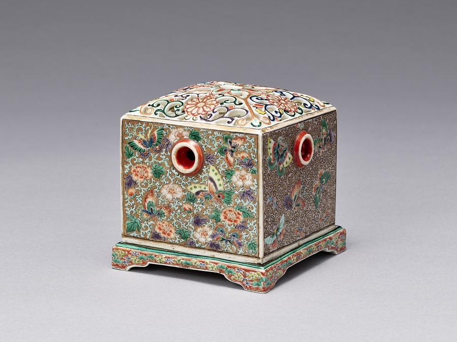 江戸時代に作られたのぞきからくりの多くは木製や笹島焼(江戸後期、文化・文政の頃、現在の名古屋市中村区で焼かれた楽焼)であり、伊万里焼は大変珍しいものである。江戸時代後期から明治にかけての科学や技術の社会への普及、見世物の流行の状況を示す作品として、きわめて貴重。天板・側板・底板を組み合わせて箱を作り、透かし彫りにした天板の上に更に透かし彫りの覆(おお)いがあり、側面に設けられたのぞき穴(計四個)を通して内部の情景を見る構造となっている。箱内部には中央にしっぽく料理風の膳を置き、その周囲に羽織姿の男子2体、三味線・鼓・琴を奏でる女子3体、扇をかざす女子1体の像を配して饗宴(きょうえん)の様子を表していて、間仕切りの障子(しょうじ)や襖(ふすま)の半分には、鏡が貼られており、情景に奥行きを与えている。