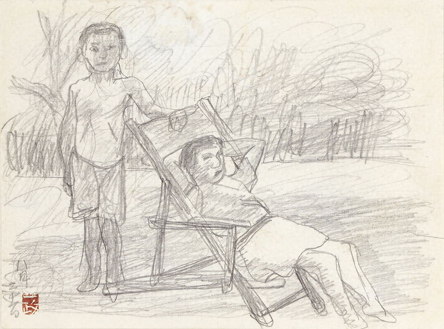 油彩《樹下子供》(1939年作)にかかる素描。東京・杉並区永福の自宅庭で、長女桃子(当時15歳)と長男鋭之助(同12歳)をモデルに描かれた。