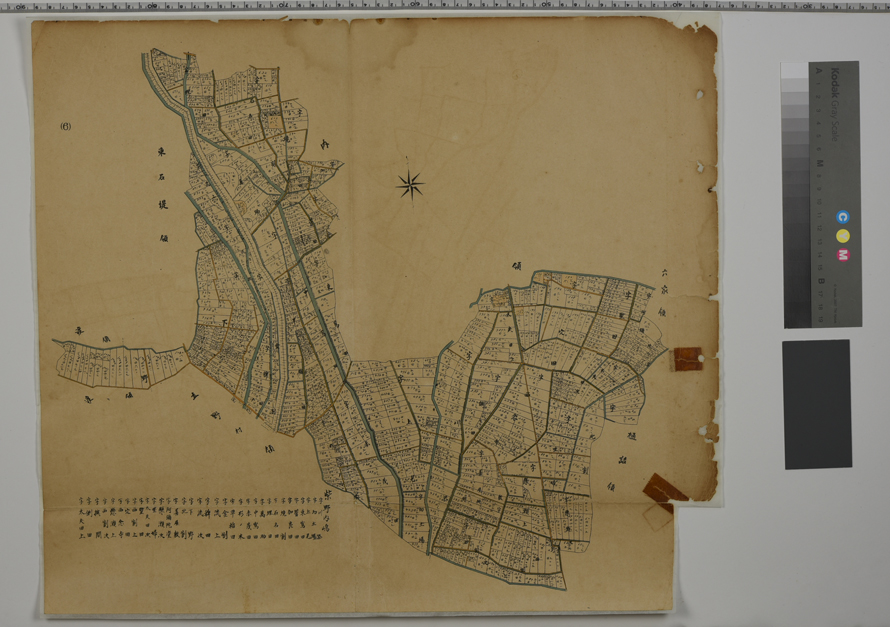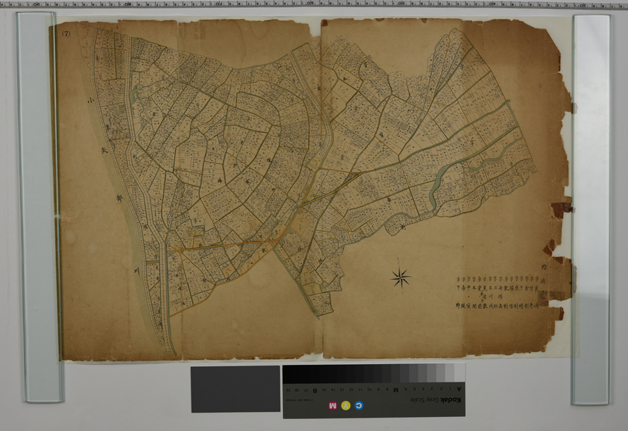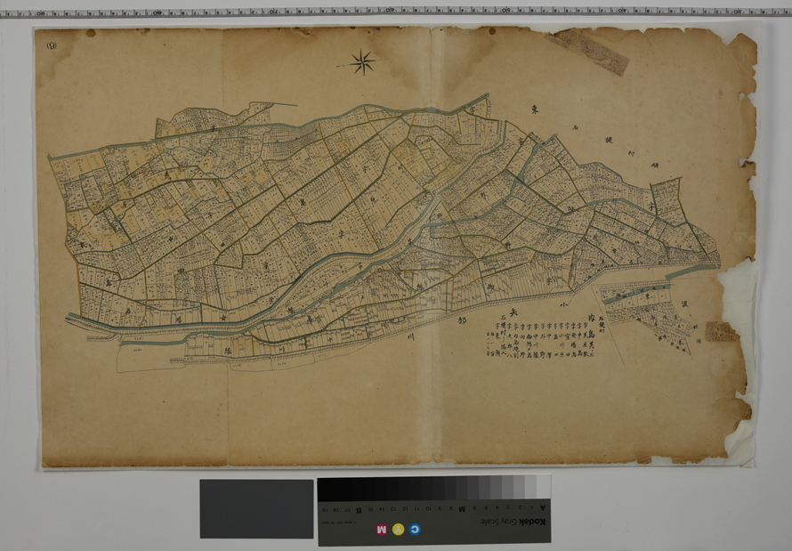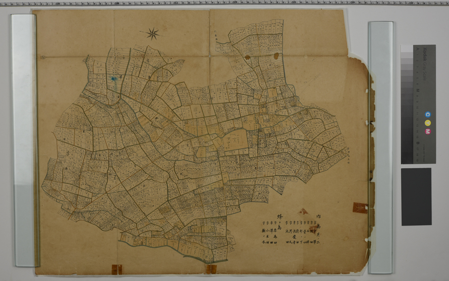 高岡市内島の地籍図。4枚ともセロテープによる補修跡や、綴って閲覧するために空けたであろう穴がある。