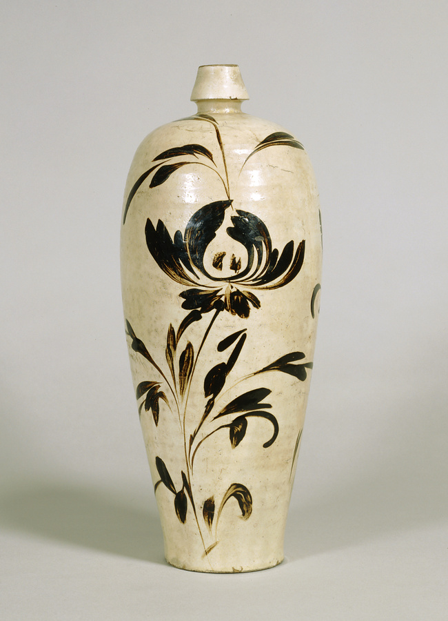 ほっそりとした形式の梅瓶(メイピン)は、北宋(ほくそう)時代から金(きん)時代にかけて流行したものです。踊るような手慣れた筆の運びの速さが、文様に生気を与えています。このようないきいきとした意匠は、量産が生んだ結果であり、日用の雑器を焼いた磁州(じしゅう)窯に特有のものです。