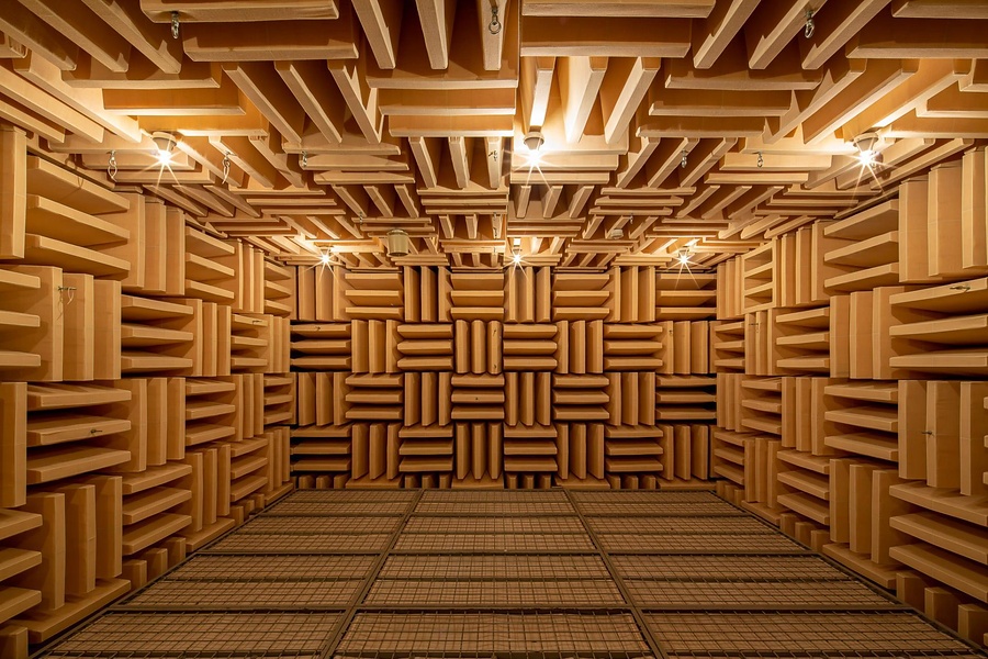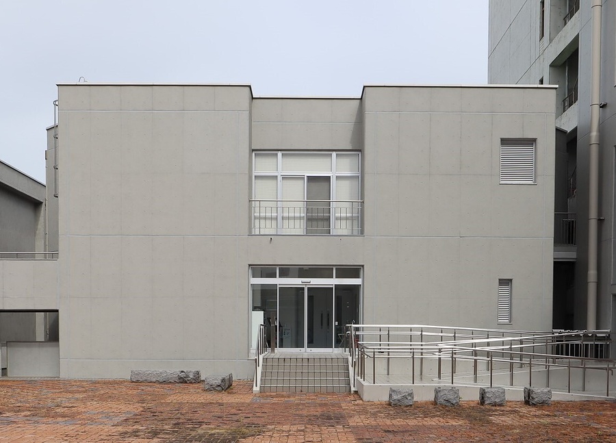 広場南東に位置し、無響室など配する音響工学専門施設。設計は香山壽夫+環境設計学科。鉄筋コンクリート造3階建、躯体打放仕上。二階レベルで中庭状広場と接続。画像特殊施設棟の立面を反転、渡廊下を挟んで左右対称の外観とし、二棟で広場東面を構成する。