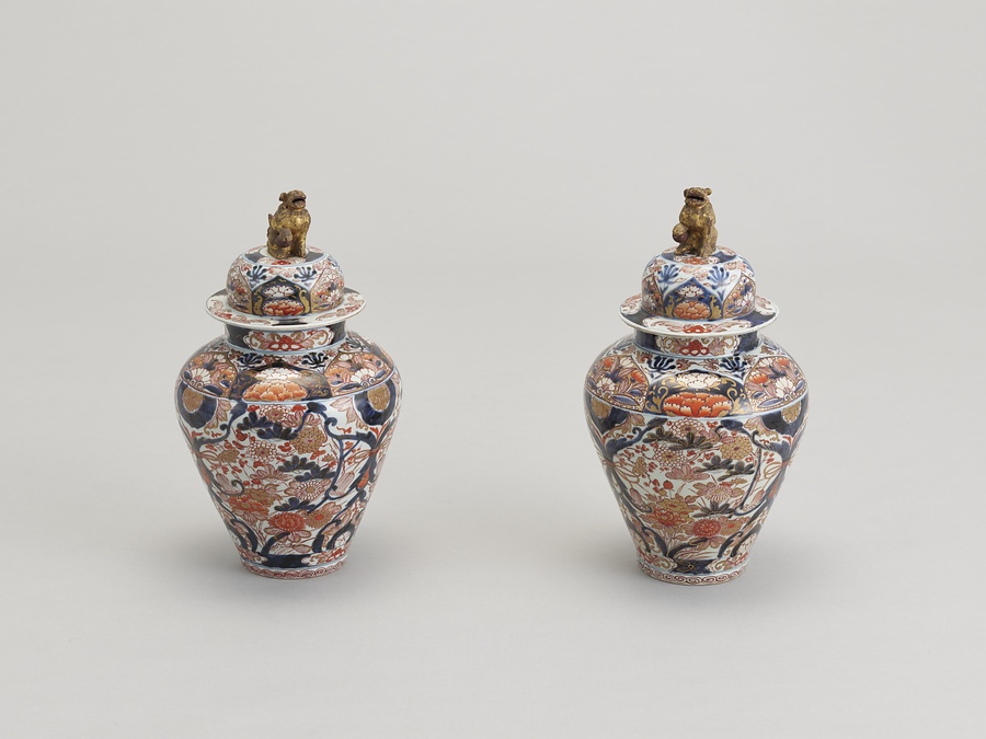 色絵菊牡丹御簾文獅子鈕有蓋壺