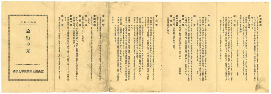 富山県立高岡高等女学校の昭和10年度の旅行の栞。注意事項、旅程、見学地の紹介文が記載されている。