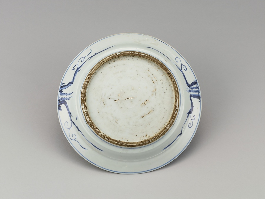 明時代末期に中国・景徳鎮窯で作られた古染付の皿で、草創期の伊万里焼は本作品のような皿を模倣した染付磁器を数多く生産した。京都画壇で活躍した田近竹邨(1864~1922)の旧蔵品で、大正12年(1923)4月の同氏の遺愛品入札会に出品された。