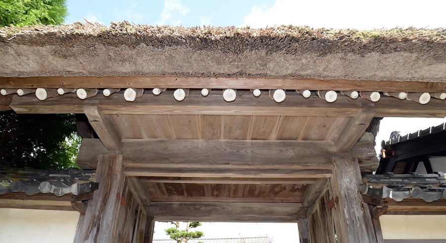 主屋正面に位置し、南面して建つ薬医門。切妻造茅葺で両脇に桟瓦葺の袖塀を付し、東に潜戸を設ける。主柱間の冠木上に架けた梁の鼻先で軒桁を支持し、丸太の垂木を架ける。内部は天井を張り、門口に両開板扉を吊る。茅葺屋根が地域の歴史的景観をつくる正門。