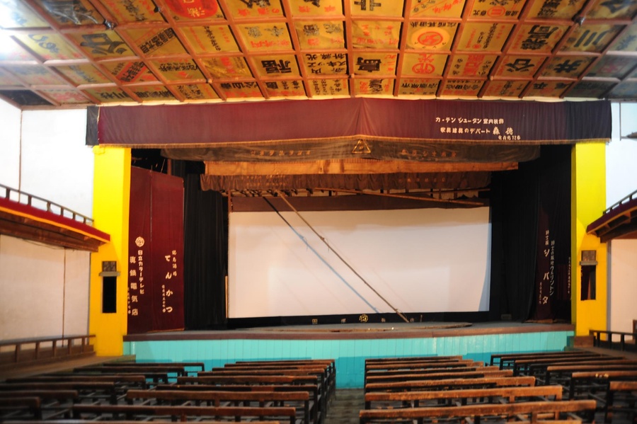 町の中心部に位置する旧芝居小屋。切妻造銅板葺で外壁を横板張とし、正面に大スパンアーチの玄関を備え、上部に屋号と劇場名を大きく記す。一階は舞台と吹抜の客席を設け、周囲に桟敷を配し、上部の格天井に往事の広告を残す。貞光町の隆盛を示す劇場建築。