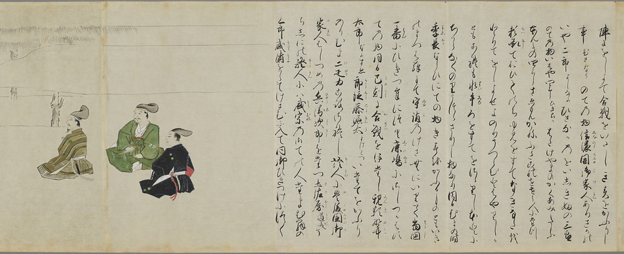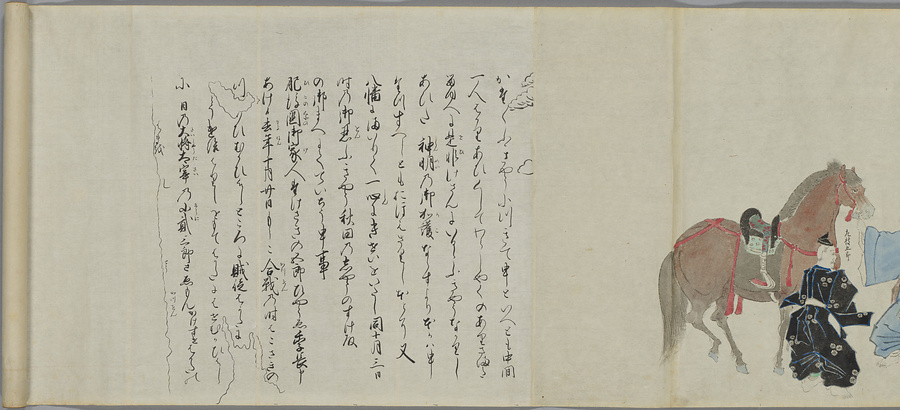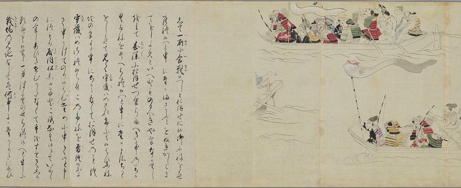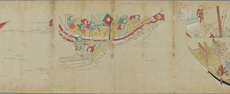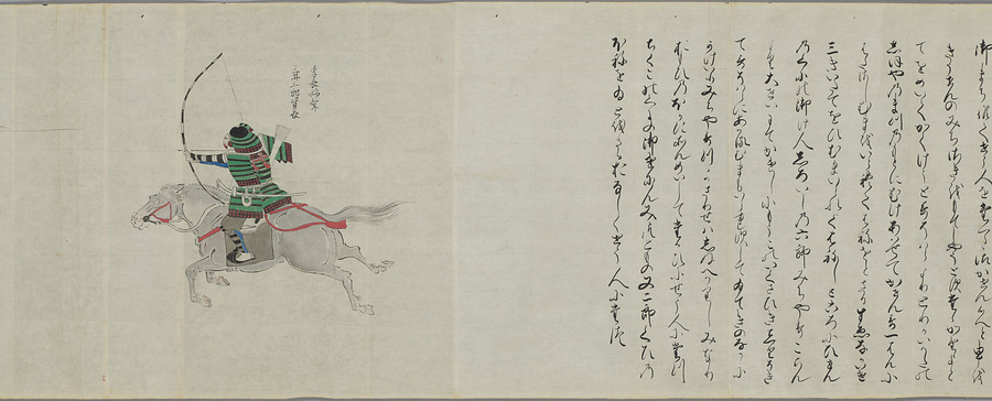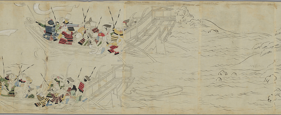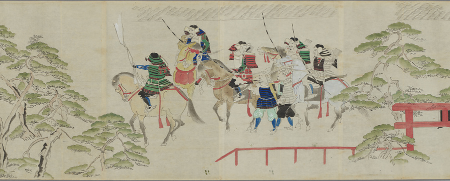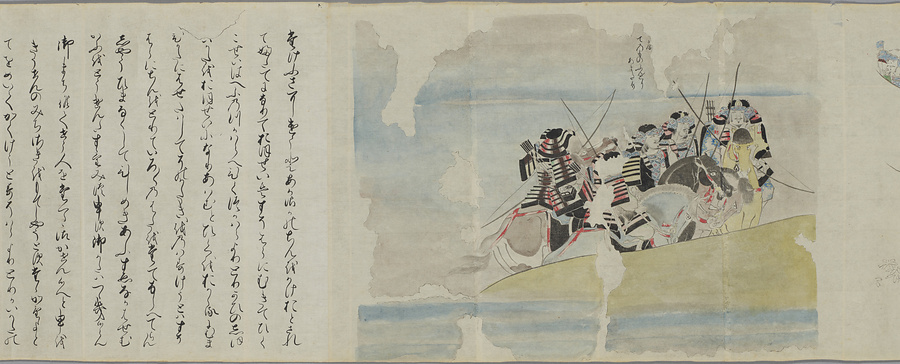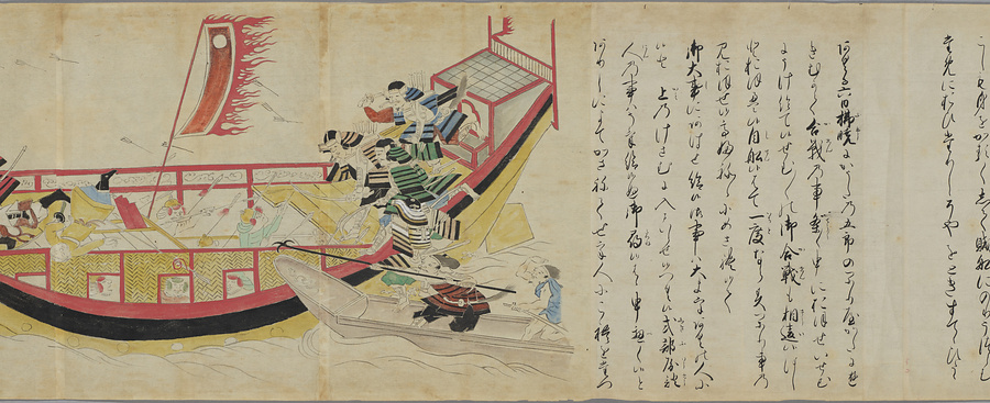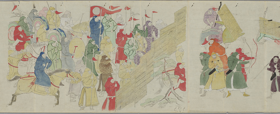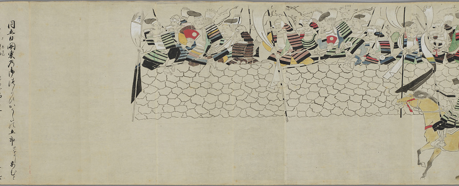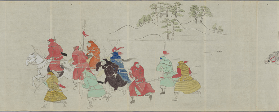 「蒙古襲来絵詞」(皇居三の丸尚蔵館所蔵、以下「原本」)の模写を2巻に成巻する。乾巻の巻頭が原本の絵11で始まることや、詞書2・絵2を含まないことから、文政11年(1828)に原本が現状の配列に成巻される以前の、古い原本の状態を伝える模本の一つである。本作品の絵は、細部の描写や彩色の多くが省略され、坤巻では画中詞も略される。だが人物の顔や髭髪、樹木等には手慣れた細やかな筆遣いも散見される。詞書は丁寧な筆致で、原本の詞書によく似る。字配りも詞書14最終行を除いて一致しており、原本に似せる意図が感じられる。本作品に押された「田藩文庫」印は御三卿の田安徳川家の蔵書印であり、「献英楼図書記」印は特に3代徳川斉匡の蔵書印と推定されている。本作品は、斉匡が当主や隠居として活動した18世紀末から19世紀前半に模写、蒐集されたと考えられる。