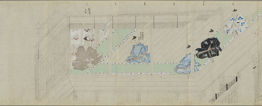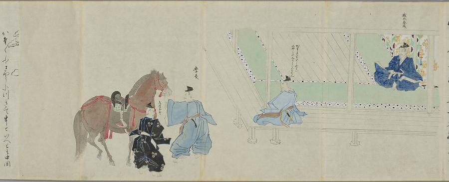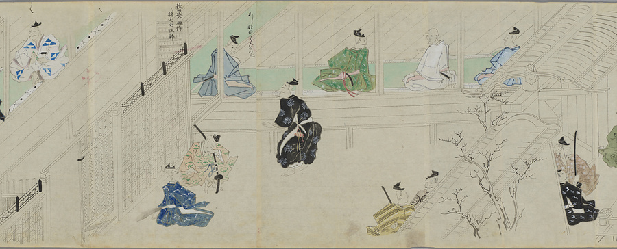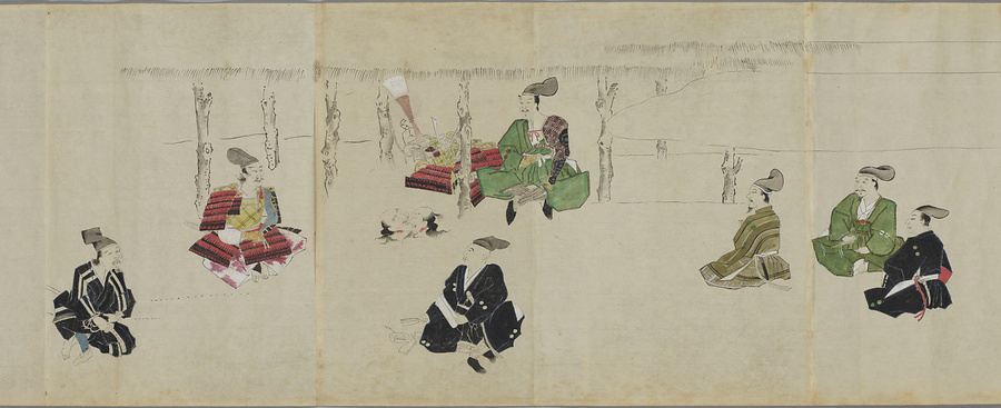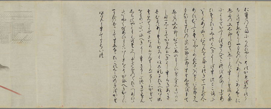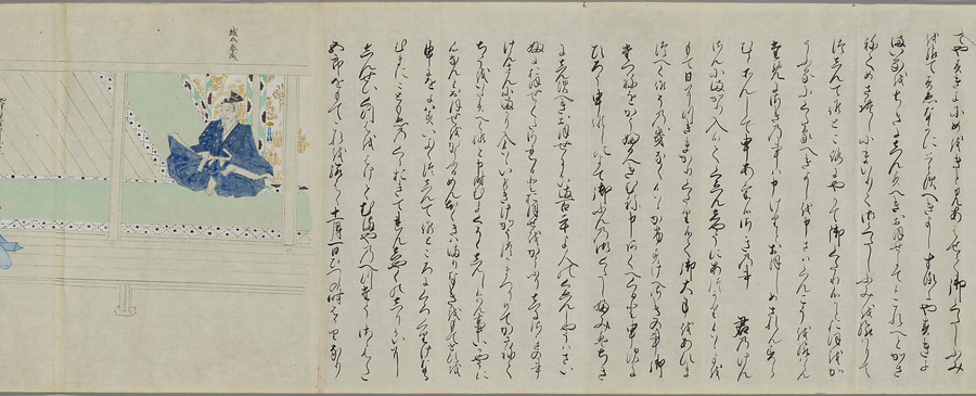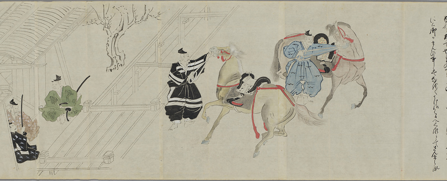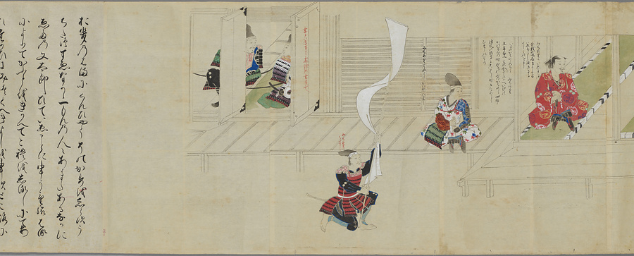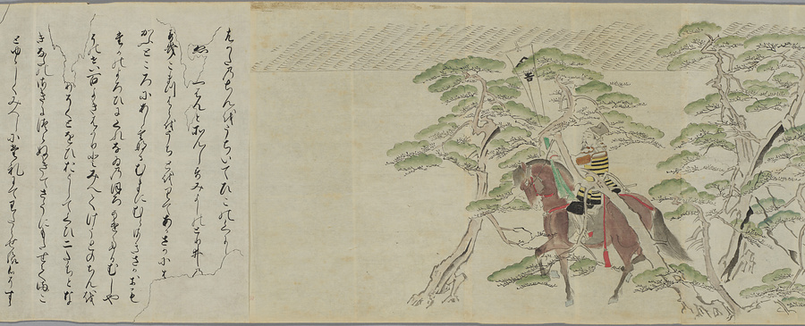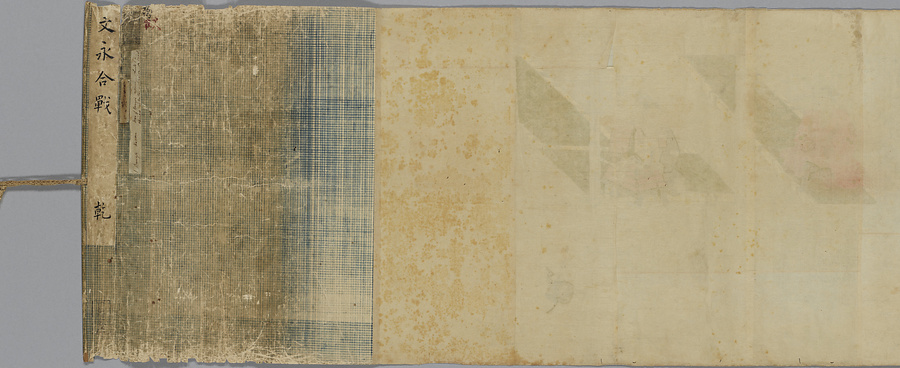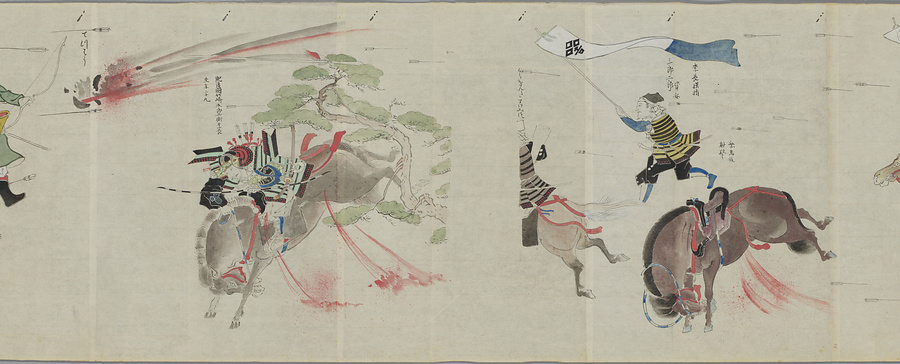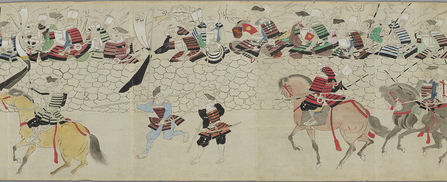 「蒙古襲来絵詞」(皇居三の丸尚蔵館所蔵、以下「原本」)の模写を2巻に成巻する。乾巻の巻頭が原本の絵11で始まることや、詞書2・絵2を含まないことから、文政11年(1828)に原本が現状の配列に成巻される以前の、古い原本の状態を伝える模本の一つである。本作品の絵は、細部の描写や彩色の多くが省略され、坤巻では画中詞も略される。だが人物の顔や髭髪、樹木等には手慣れた細やかな筆遣いも散見される。詞書は丁寧な筆致で、原本の詞書によく似る。字配りも詞書14最終行を除いて一致しており、原本に似せる意図が感じられる。本作品に押された「田藩文庫」印は御三卿の田安徳川家の蔵書印であり、「献英楼図書記」印は特に3代徳川斉匡の蔵書印と推定されている。本作品は、斉匡が当主や隠居として活動した18世紀末から19世紀前半に模写、蒐集されたと考えられる。