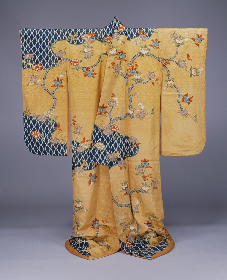 刺繍(ししゅう)・鹿の子(かのこ)絞り・摺匹田(すりびった)を併用した武家女性の振袖。インドの生命の樹にその原点があるといわれる立木模様は、富貴の象徴である牡丹と、常緑=永遠の若さの象徴である橘の実のデザインで、ともに吉祥模様として江戸時代に好まれた。