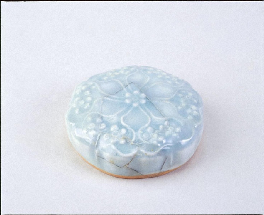 合子は蓋付きの小さい容器のこと。青白磁は、釉薬に含まれる微量の鉄分によって淡い青白色に発色した白色素地の磁器。Ⅳ期(15世紀後半から16世紀初頭)の遺構から出土。
