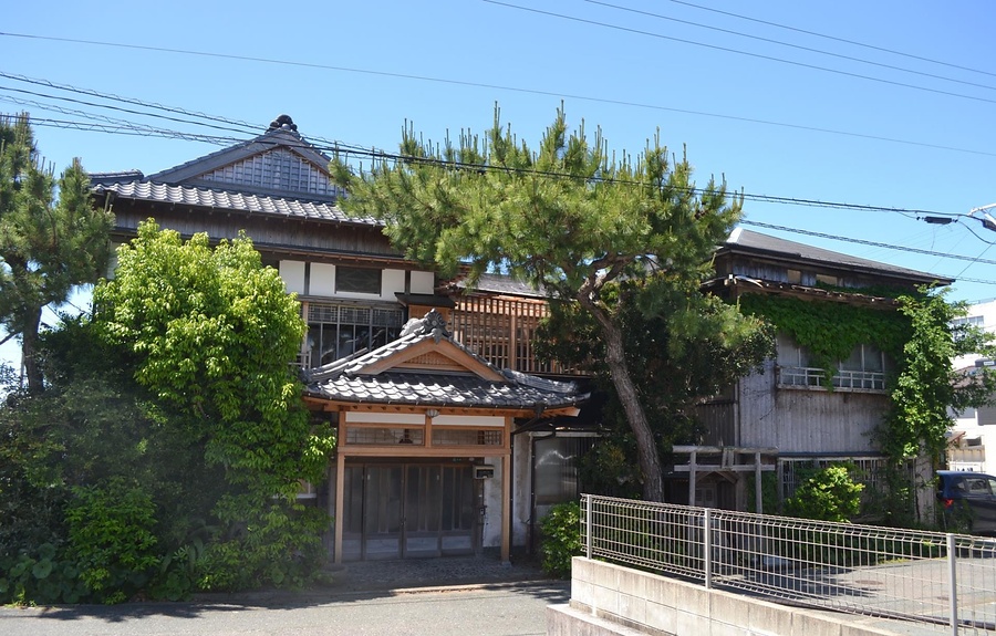 津屋崎海岸の東側に建つ旧旅館。通りに東面する2階建桟瓦葺で北東に玄関を付す。各階、中廊下を東西に通して客室を並べ、2階は南西に続き間座敷を配し、連窓を建てた広縁を介して海を望む。増築を重ねて、部屋数を増やし、海水浴客の賑わいを伝える旅館。