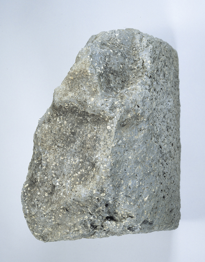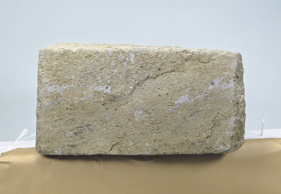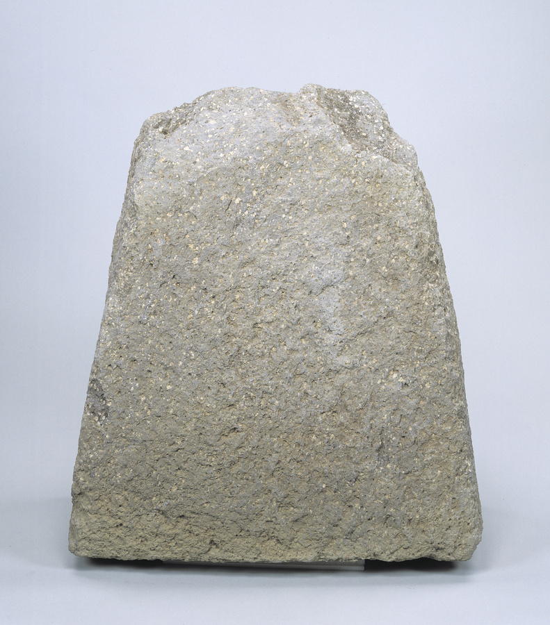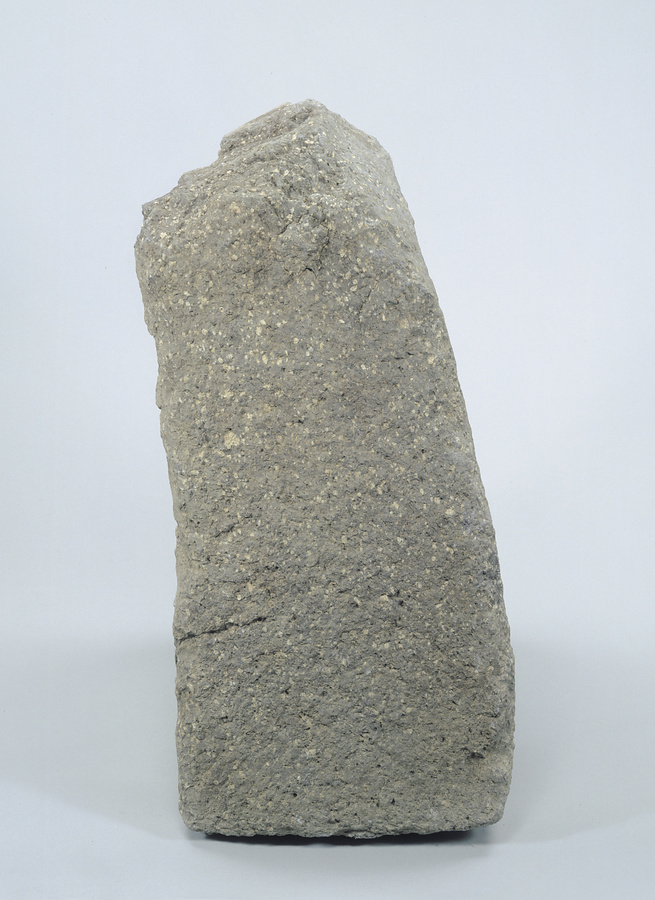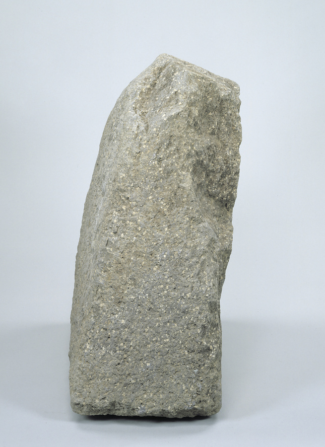 将棋の駒に似た高さ47㎝・幅46㎝・厚さ長24㎝の榛原石製石造物。玄室中央に直立したままで出土したことから、本来の位置を反映しているとみられる。奈良県高松塚古墳でも、玄室前方に用途不明の大型石材が出土しており、葬送儀礼に使用されたと考えられている。