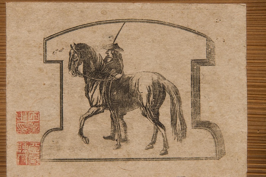 亜欧堂田善の『江戸名所図』を収めた外箱に張り付けられた銅版画。ドイツの銅版画家リーディンガーの曳馬図を参考にした作品。箱裏には「腐法江戸諸勝図 阿武隈川水源図凡八葉」と菅茶山自筆で記されている。腐法は、銅版画の技法の一つであるエッチングのことをいう。阿武隈川水源図は、書画類93の「陸奥国石川郡大隈瀧芭蕉翁碑之図」であろう。