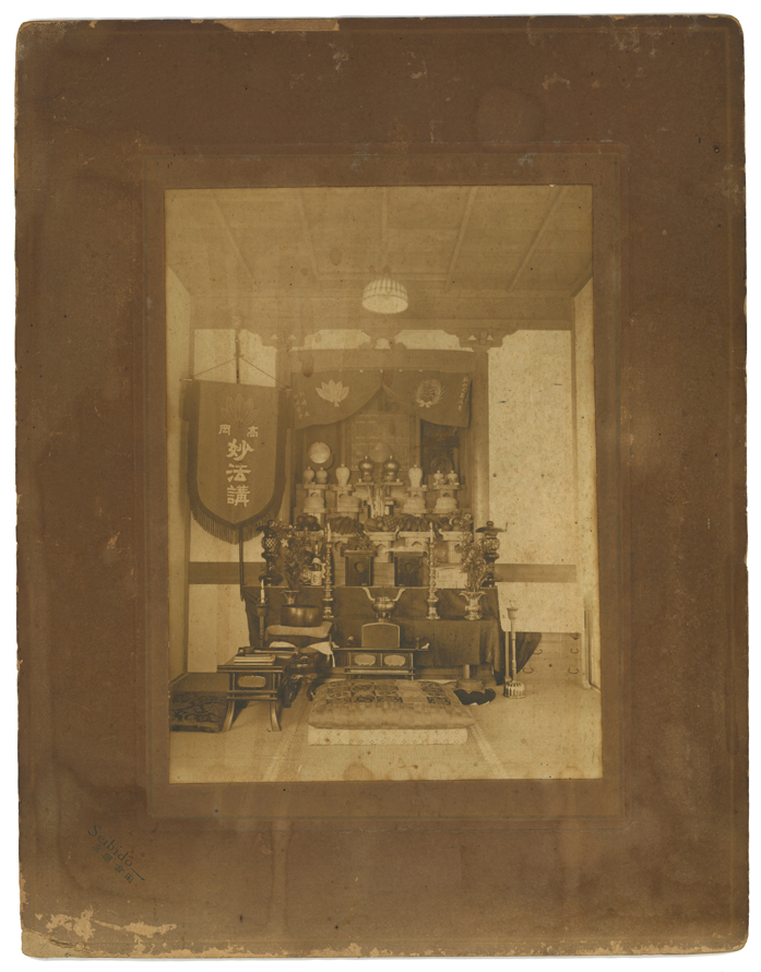 祠の上部には、天狗の羽団扇と稲の紋が入り「昭和七年八月」の文字が書かれた幕が写っている。また向かって左側に、上部に天狗の羽団扇が描かれ、「高岡/妙法講」と書かれた会旗が掲げられている(妙法講は日蓮宗)。