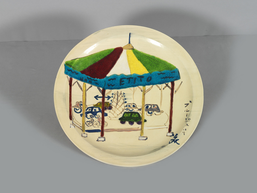 「ブルージュにて」と書き添えられており、花柳章太郎が昭和33年(1958)の海外旅行の際に訪れた、ベルギーのブルージュの景色を描いた皿。屋根の下に複数の車が描かれており、自転車のようなものも見える。中央に電飾のついた棟のようなものが描き込まれており、遊園地などの遊具のようにもみえる。