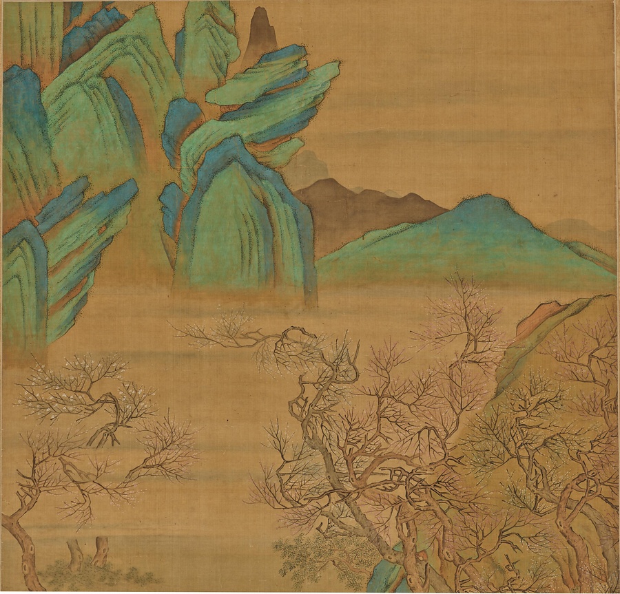 「光陰【こういん】は百代【ひゃくだい】の過客【かかく】なり」の句で有名な、李白【りはく】(701~62)の詩「春夜宴桃李園序@しゅんやとうりえんにうたげするのじょ@」の舞台を描きます。文人たちは、春の夜、満開の桃の下で、酒を楽しみながら詩作にふけります。仇英は仕女図を得意とした明【みん】時代の人気画家で流派作が多くのこります。