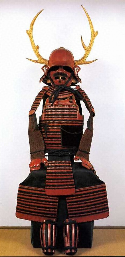 庄内藩酒井氏の祖酒井忠次所用の具足である。同人所用のものに重要文化財色々威胴丸があるがこれは儀式用と見られ、この具足は実用のものと推定される。胴丸形式を一歩進めた桃山時代の典型的な具足である。すこぶる簡素な具足であるが、全体を朱漆塗とし、黒糸で威し、兜は筋兜で金箔鹿角を脇立てとしたもので、全体に製作も良く、徳川四天王の一人として活躍忠次の人柄が偲ばれる貴重な具足である。