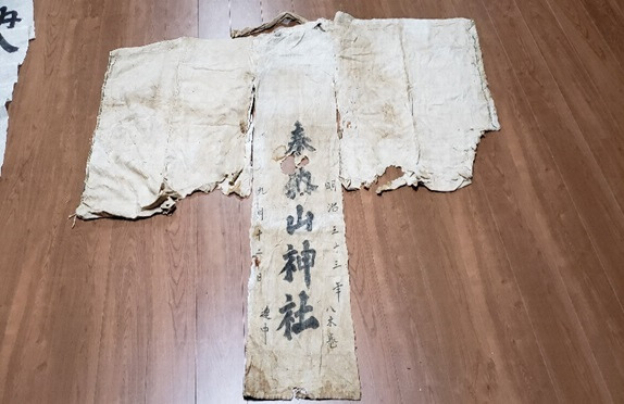 今回追加指定する物件は、「安政六年銘 獅子頭権現幕」(1枚)、「獅子頭」(2頭)、「明治三十三年銘 神楽衣装(千早)」(1着)の神楽資料4点である。