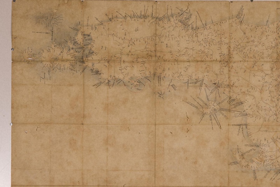 本図は、明暦の大火(明暦3年〔1657〕)で「正保日本図」が焼失した後に、幕府が再度製作した日本地図の系統とみられる手書の大型日本図。街道・海路が朱線で書かれ、街道には1里ごとに「:」印が付けられている。港や河口付近の注記が詳しいのが特徴。褪色が著しいが、旧国や海には彩色が施されている。本図の縮尺は「正保の日本図」と同様、六分一里(約21.6万分の1)である。