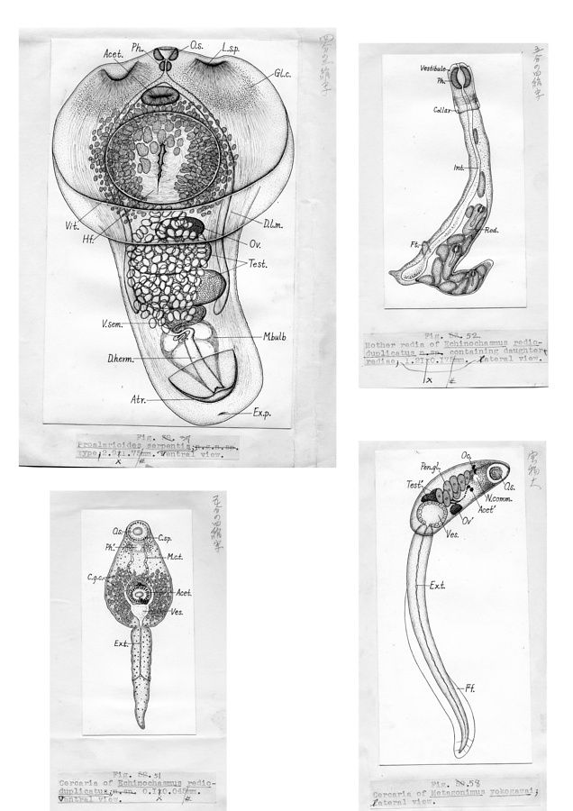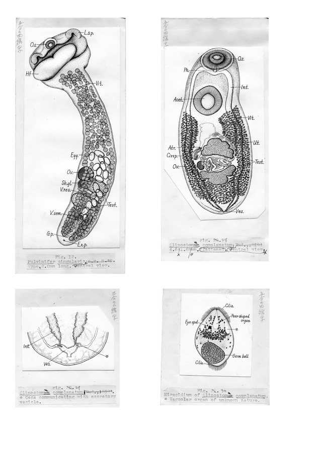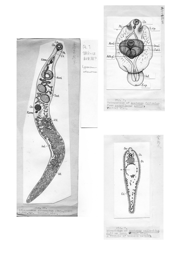日本の寄生蠕虫相の研究,第1部.鳥類・爬虫類・哺乳類の吸虫類.原図(部分)