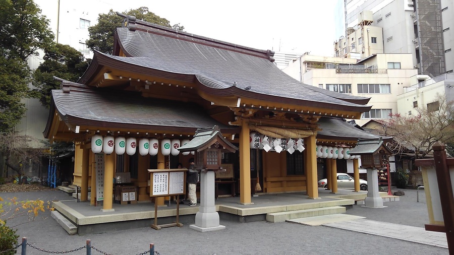 本殿前面に建つ鉄筋コンクリート造社殿。南から下拝殿、上拝殿、幣殿とし、下拝殿は入母屋造向拝付で両側に下屋を付し、幣殿左右に祭器殿と神饌殿を張出し全体エ字形平面とする。幣殿を含め屋根を重ねた抑揚感ある外観を呈する。戦後間もない耐火構造の社殿。