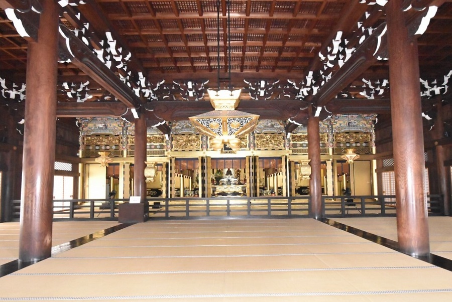 七条堀川の北西に位置する浄土真宗興正寺派の本山寺院の御影堂。境内中央に東面して建つ入母屋造本瓦葺で正面に3間向拝を付す。内陣及び余間の柱や壁面は金箔押、組物及び欄間は極彩色とし、荘厳を極める。明治35年大火後に復興した、大規模な近代の仏殿。