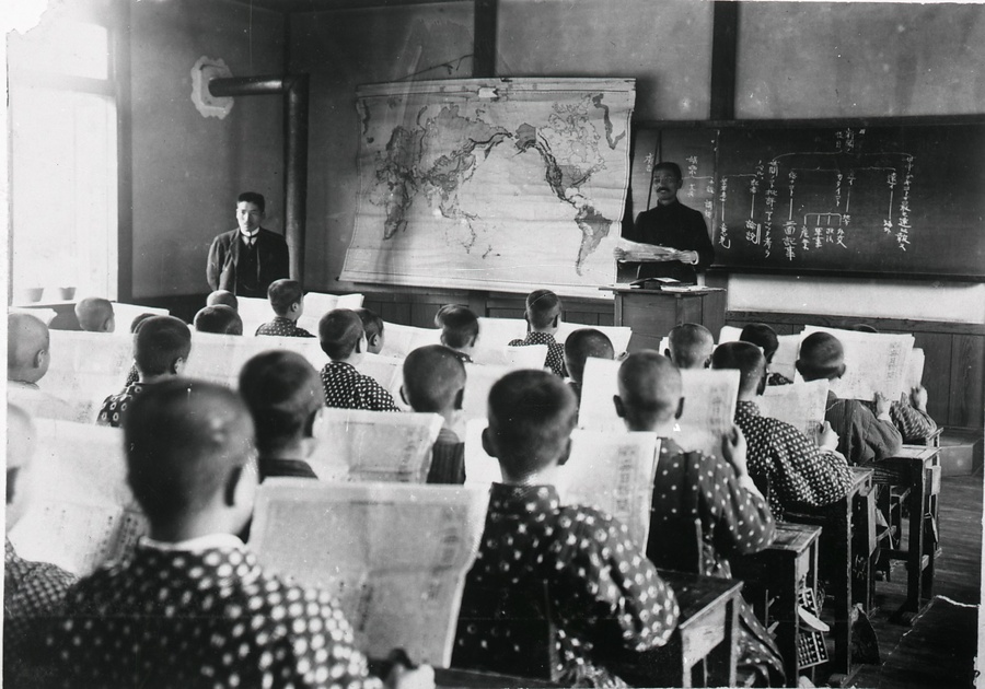 大正期には学校教育のなかにも自由主義思想が取り入れられ、私立小学校や師範学校附属小学校を中心に、いわゆる大正新教育運動が展開した。この写真には、「戦友」の作詞者であり、京都市で新教育運動の中心的な人物の一人であった眞下瀧吉(飛泉)が傍らに写っている。