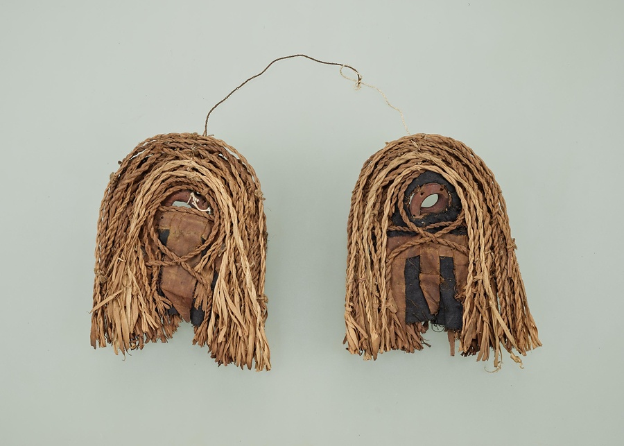 イオマンテで送られるクマが身につけるもので、削り懸けを用いて作られています。半円形の飾りの中心は色裂(いろぎれ)で装飾しています。人間の国ではこのように子グマをきれいに着飾って大切にしているのだから、また遊びに来るようにとの願いがこめられています。