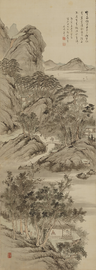 長崎三大文人画家の一人、木下逸雲(一七九九?~一八六六)の最晩年の作。款記から、九十九里浜の大網元で画家でもあった斉藤巻石の邸宅で描かれたとわかる。自賛には、唐時代の霊一による「野泉煙火白雲間、坐飲香茶愛此山、崗下維舟不忍去、青谿流水暮潺々」(「与元居士青山潭飲茶」)という七絶が引用されている。涼炉で湯を沸かす野点の様子や遠景の帆船、爽やかな水の流れが添えられ、賛詩の内容を踏まえた描写となっている。