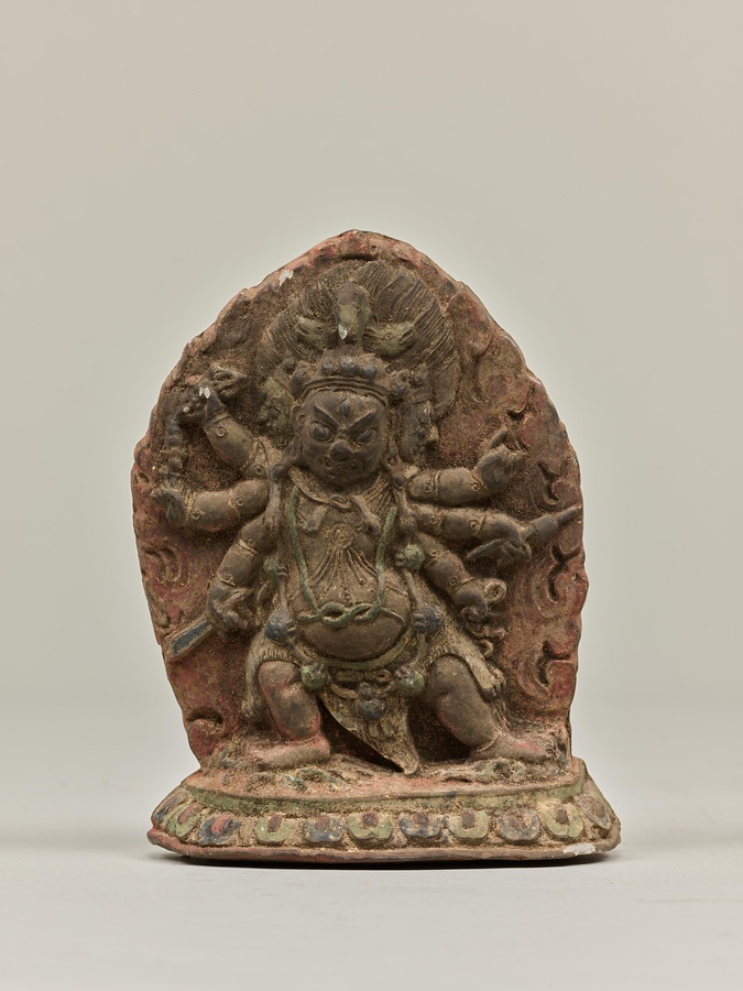 頭上に馬を戴きながら、三面六臂の異形に表わした馬頭尊。チベットで馬頭尊は観音ではなく明王にあたる忿怒+ふんぬ+尊に分類されますが、それにふさわしい姿です。粘土を型に嵌+は+めて乾燥させたサッチャとして造られました。背面には下に敷かれた布の布目が残ります。