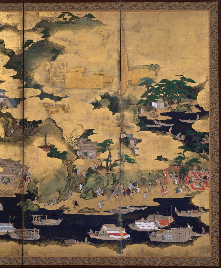 現在の広島県にある厳島神社を描いた屏風です。厳島を北側から見た景色を、遊楽に来る人びとの活気とともにあらわしています。島に舟で辿りつく参拝者、彼らを宿坊に迎え入れもてなす人びとなどが生き生きと描かれ、その賑わいが聞こえてきそうです。