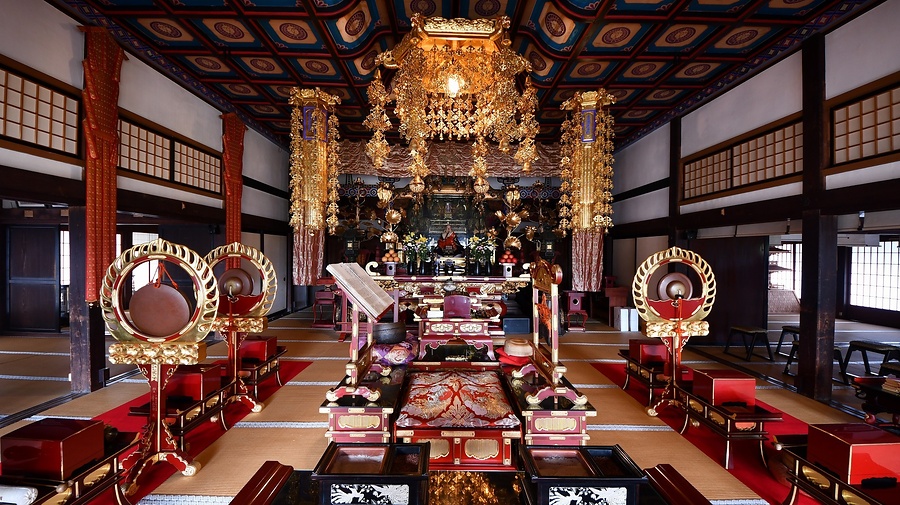 富士川右岸の境内に東面して建つ日蓮宗寺院本堂。桁行約二〇メートル、入母屋造桟瓦葺、正面向拝付。前面に吹放ちの外陣を通し、六室を配す。堂内中央は内陣と内々陣で、両室は格天井中央を折上げ、格間に彩画を飾り荘厳する。下山大工の力量を示す大型本堂。