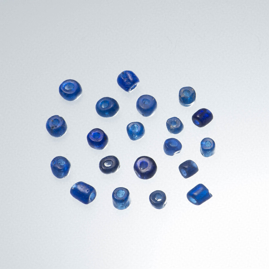 続縄文時代後半期の土坑墓からの出土品。常呂川河口遺跡で出土したガラス玉には淡青色のものと、それより一回り大きい濃青色のものの2種類がある。この資料は後者の濃青色のもので、径5~7mm、厚さ3~7mmの大きさである。これらのガラス玉の製作地は不明だが、成分分析からは中国大陸産の原料が使われたことが示唆されている。